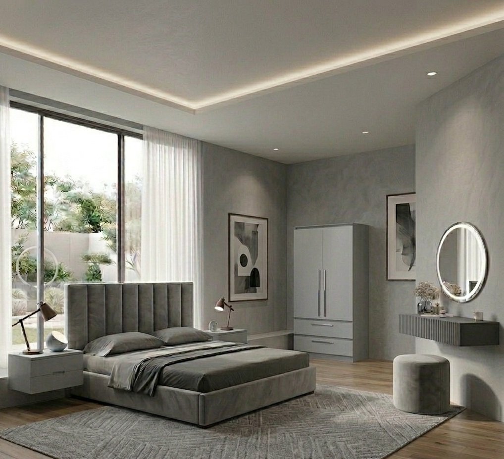 The suite includes a beautifully upholstered bed with a soft curved headboard, two floating bedside tables, a spacious wardrobe for organized storage, ottoman , and a stylish dressing table with mirror. The neutral tones and clean lines create a calm and sophisticated atmosphere, easily blending with various interior styles.