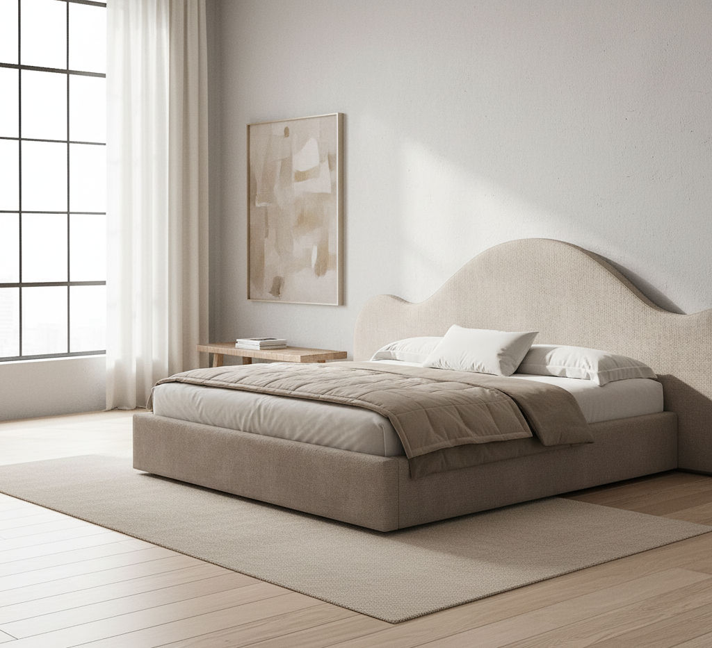 The Mirelle Wave Arc Bed by LP Furniture brings a soft, sculptural elegance to modern interiors. Designed with a beautifully contoured wave-style headboard, this bed creates a serene visual flow that enhances any bedroom aesthetic. Fully upholstered in premium fabric, it offers a warm, sophisticated look while ensuring long-lasting comfort and durability.