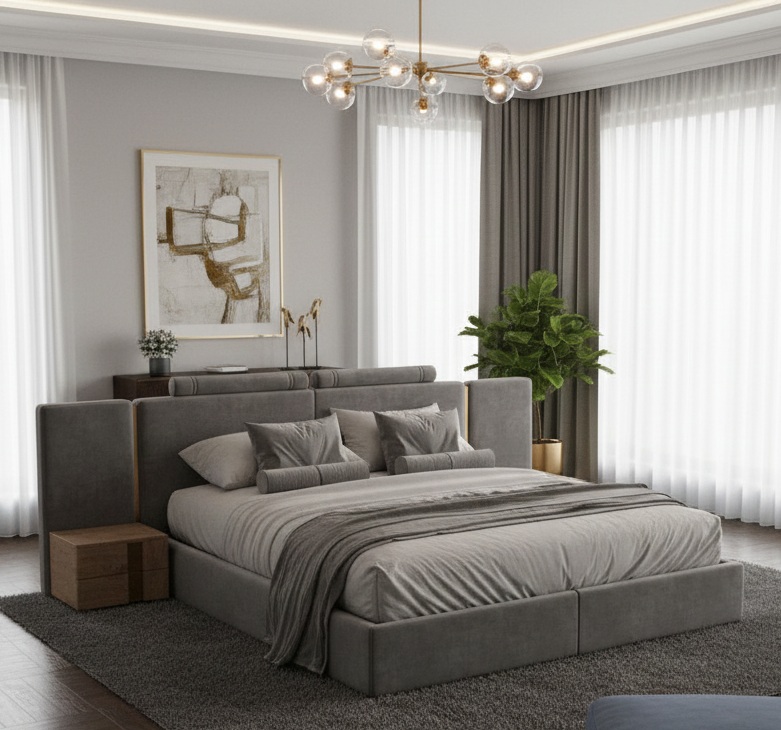 Upholstered in premium-quality fabric with a refined finish, the Plushara High Headboard Bed adds a sophisticated touch to modern and contemporary interiors. Its strong frame construction ensures stability and long-term durability, while the plush headboard creates a striking visual centerpiece for your space. A perfect blend of comfort, style, and functionality, this bed transforms everyday sleep into a luxurious experience.